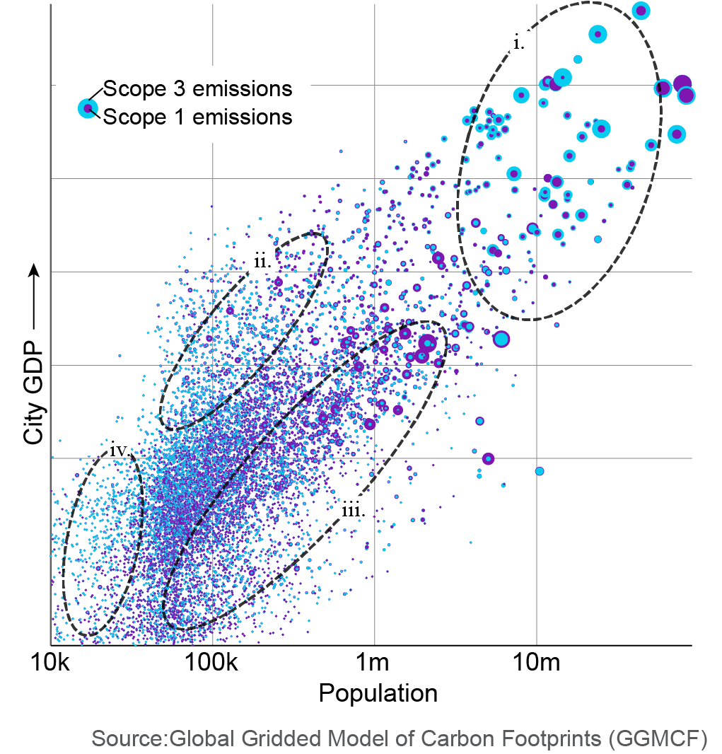 Scope 1 (purple) vs. Scope 3 (blue) emissions, by city Different types of cities: i. populous, high GDP with large footprints (Scope 3>Scope1) include London, Paris, Seoul; ii. smaller, mid-GDP carbon importers, e.g. Oslo; iii. larger, low GDP producers; includes many manufacuturing-intensive Chinese cities; iv. smaller cities, primarily residential, where predominantly Scope 3 > Scope 1. PNG