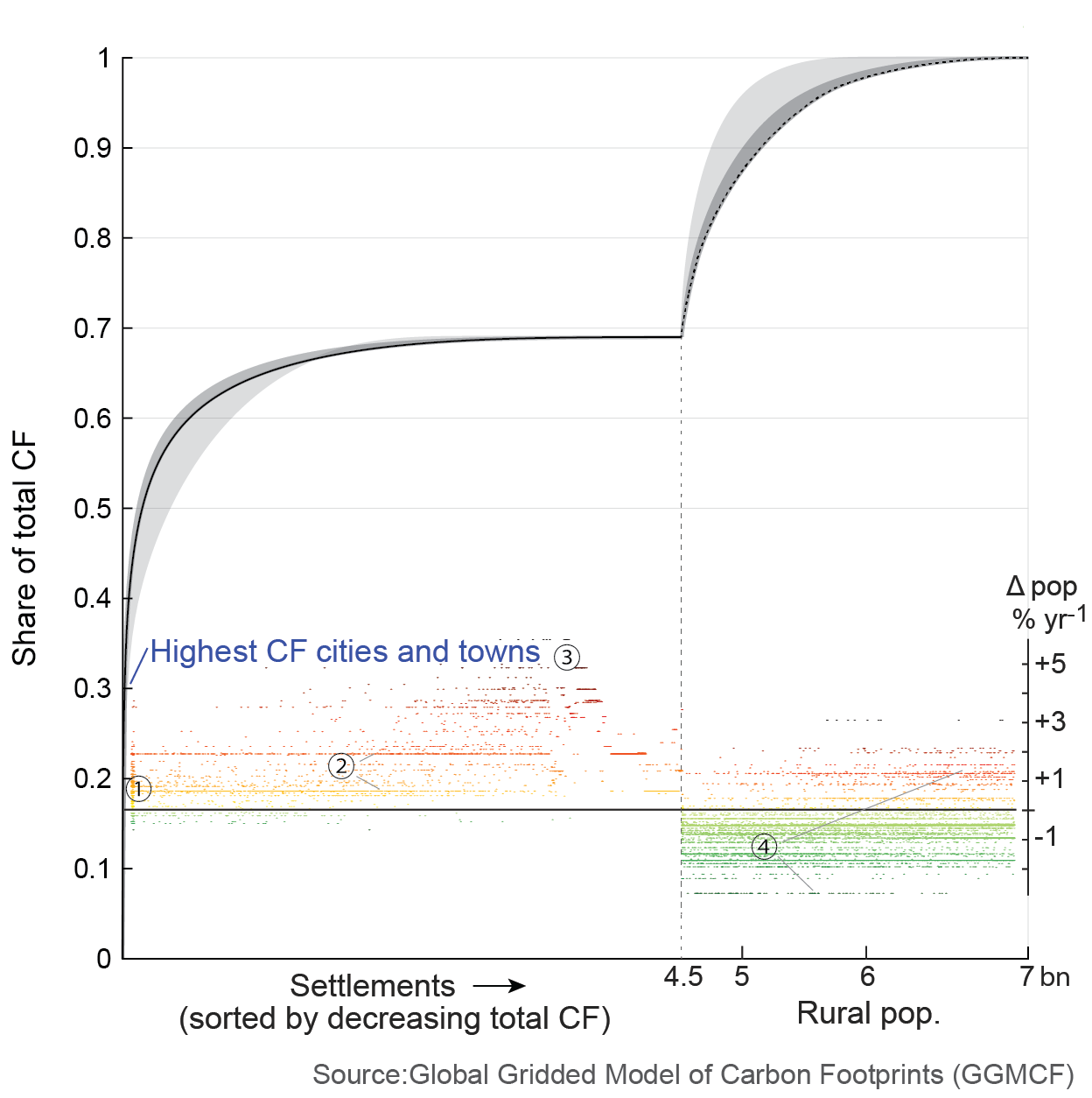 Cities contain 60% of global population and drive 64% of global carbon footprint (CF), but within this the CF is highly concentrated in a small number of high CF cities and high CF/capita suburbs, while populous low CF cities and rural low CF areas contribute relatively little to the total global CF. The lower area shows UN projected growth rates 2020-2050 for each grid cell. The highest growth is expected in low CF cities and declining growth in rural areas, with ① modestly high growth rates around 1-2%/yr for top-CF cities, ② bands visible for cities in India (1.9%) and China (0.6%) across all city sizes, ③ fastest-growing cities currently contributing little to global CF, and ④ declining rural populations all CF/capita, with rural depopulation in Japan (-2.8% capita/yr) visible, but some growth in lower CF/capita regions. PNG SVG