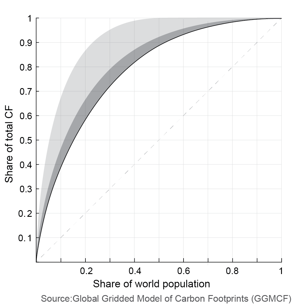 Lorenz curve of gridded carbon footprints shows highest CF/cap decile drives ~40% of global CF CF. The shaded area indicate the range of alternative Lorenz curves constructed during the sensitivity analysis: dark shading indicates individual grid cells were allowed to vary ± 100% and lighter indicates they were allowed to vary ±1000%. (See paper and SI for details.) PNG SVG