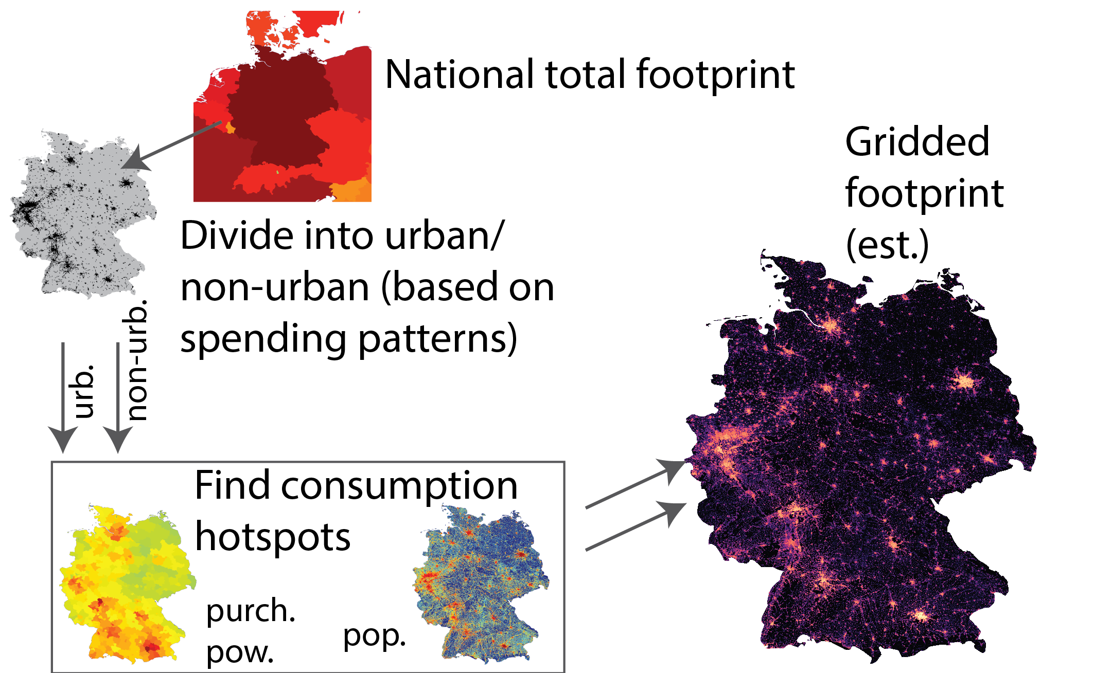 Construction method for gridded model of carbon footprints. The national total footprint (or state/subnational unit footprint for the countries for which subnational data exist) is split in to urban and non-urban components based on relative spending patterns, then spatialized using purchasing power and population. This approach is comprehensive and consistent globally but cannot substitute or individual city footprint accounts based on local data. PNG