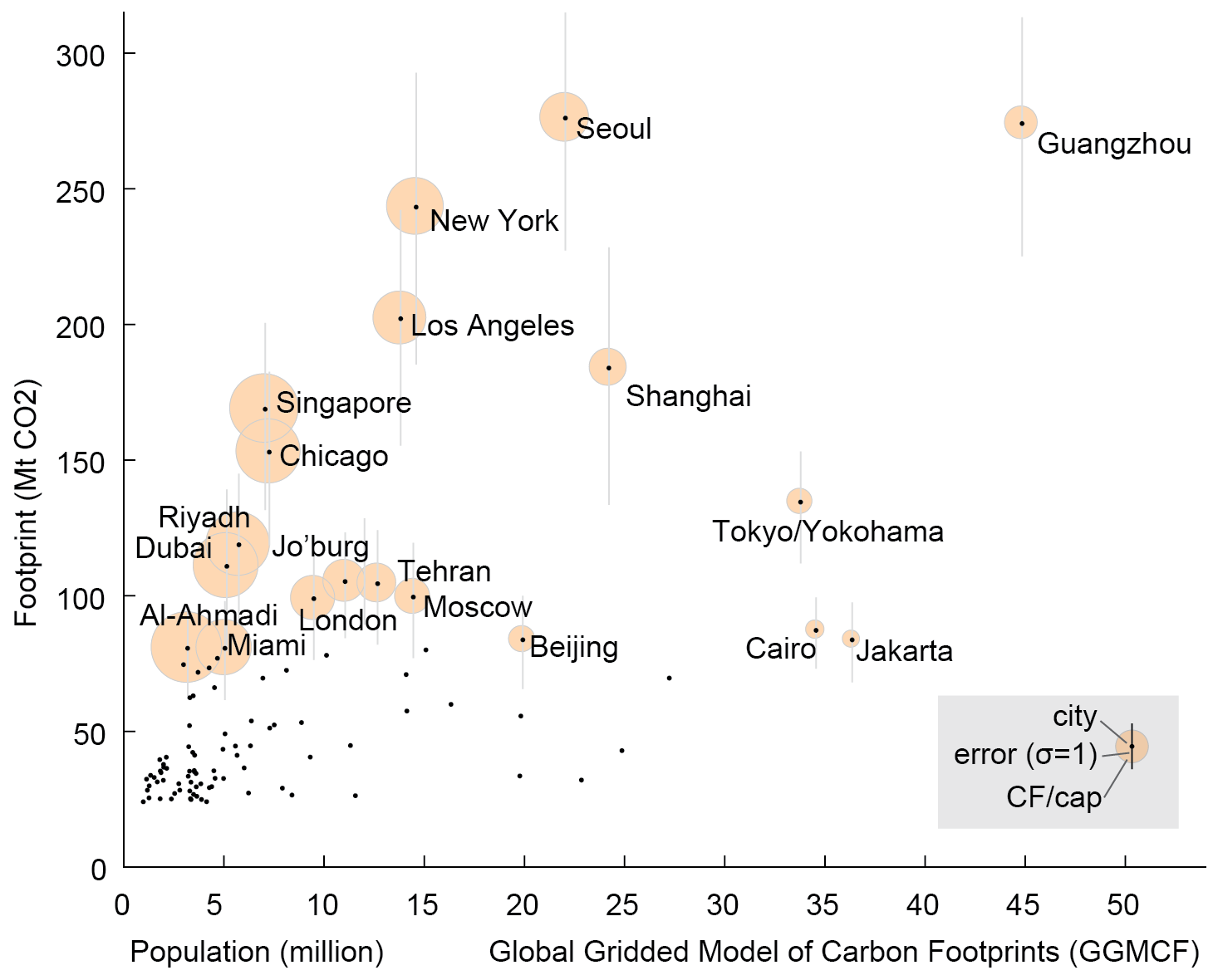 The cities with the largest total footprints (named here are the top 20) have a large CF due to a combination of population and high CF/capita (bubble size). Cairo and Jakarta have relatively low CFs per capita but large populations, while Miami and Al-Ahmadi in Kuwait have smaller populations with higher average footprints, and thus similar total CFs. Vertical lines show 1 standard deviation for each city CF estimate. [PNG SVG